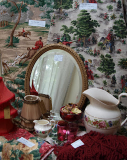 Some more Cloth Shed stock to include lengths of unused Sanderson fabric.... lovely hunting print linen, bullion fringing, lampshades, cranberry glass, and floral jugs......